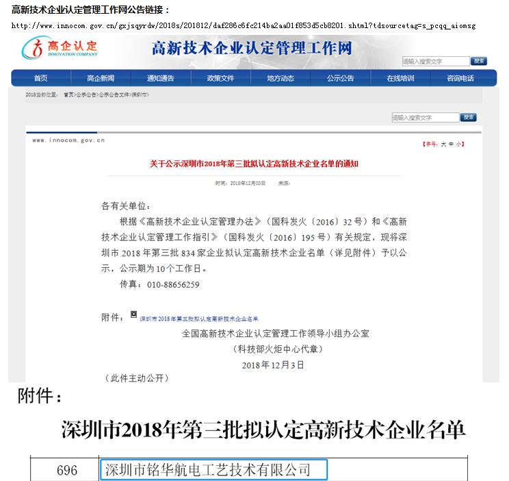 熱烈祝賀銘華航電獲得國家高新及深圳市高新雙新認證